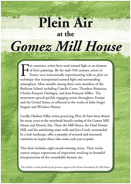 Exhibit of local Orange and Ulster County Plein Air artists works of the Gomez Mill House.