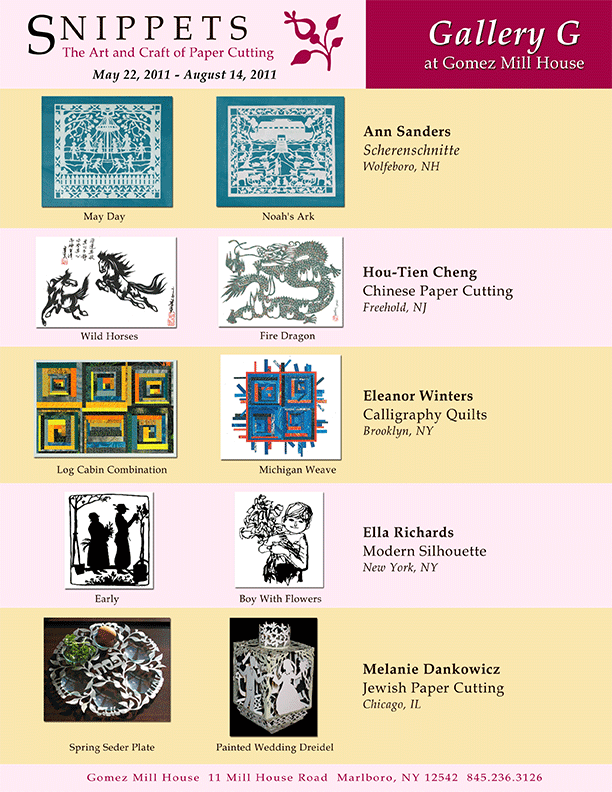 Inaugural Gallery G exhibit featuring works by artists using five paper-cutting techniques: Chinese, German Scherensnitte, Jewish, modern silhouette, and mosaic with calligraphy.